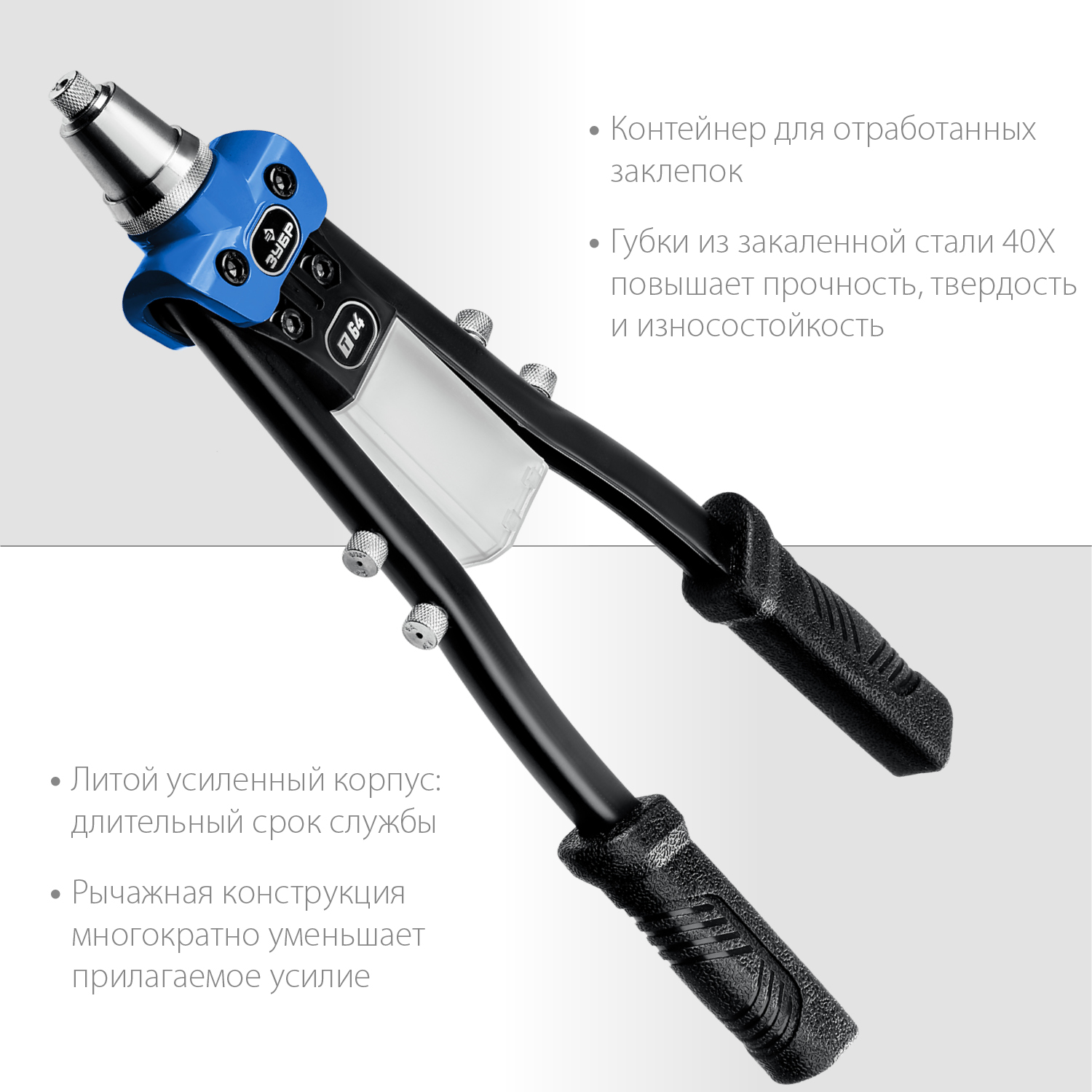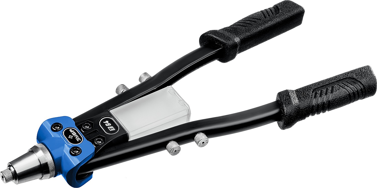 Надежный инструмент для установки вытяжных заклепок. Двухрычажная конструкциия значительно облегчает работу.