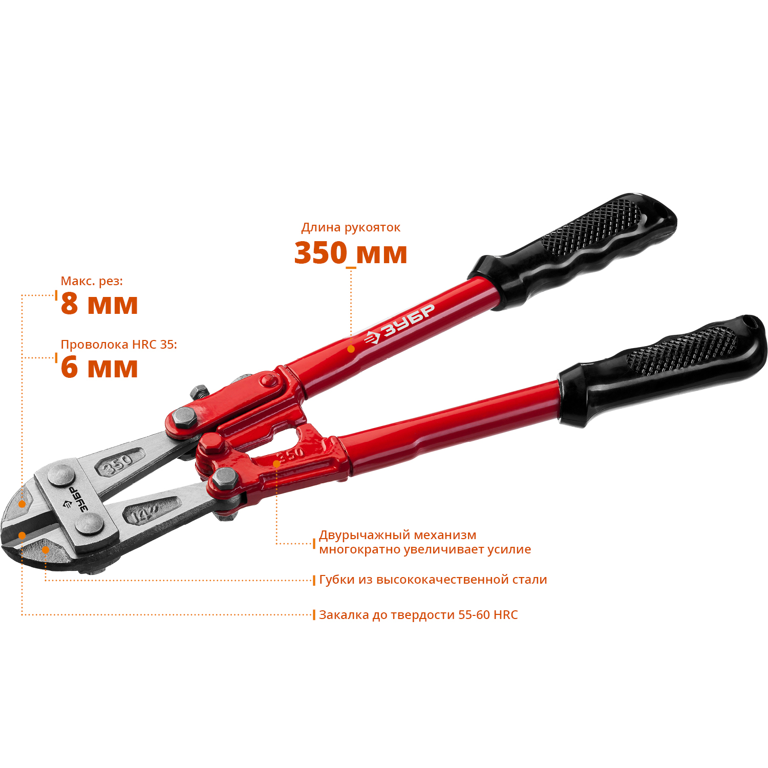 Болторез max d=8 / HRC35 d=6 350 мм Зубр 23313-035 подойдет для перекусывания жесткой проволоки, а также арматурных прутков.