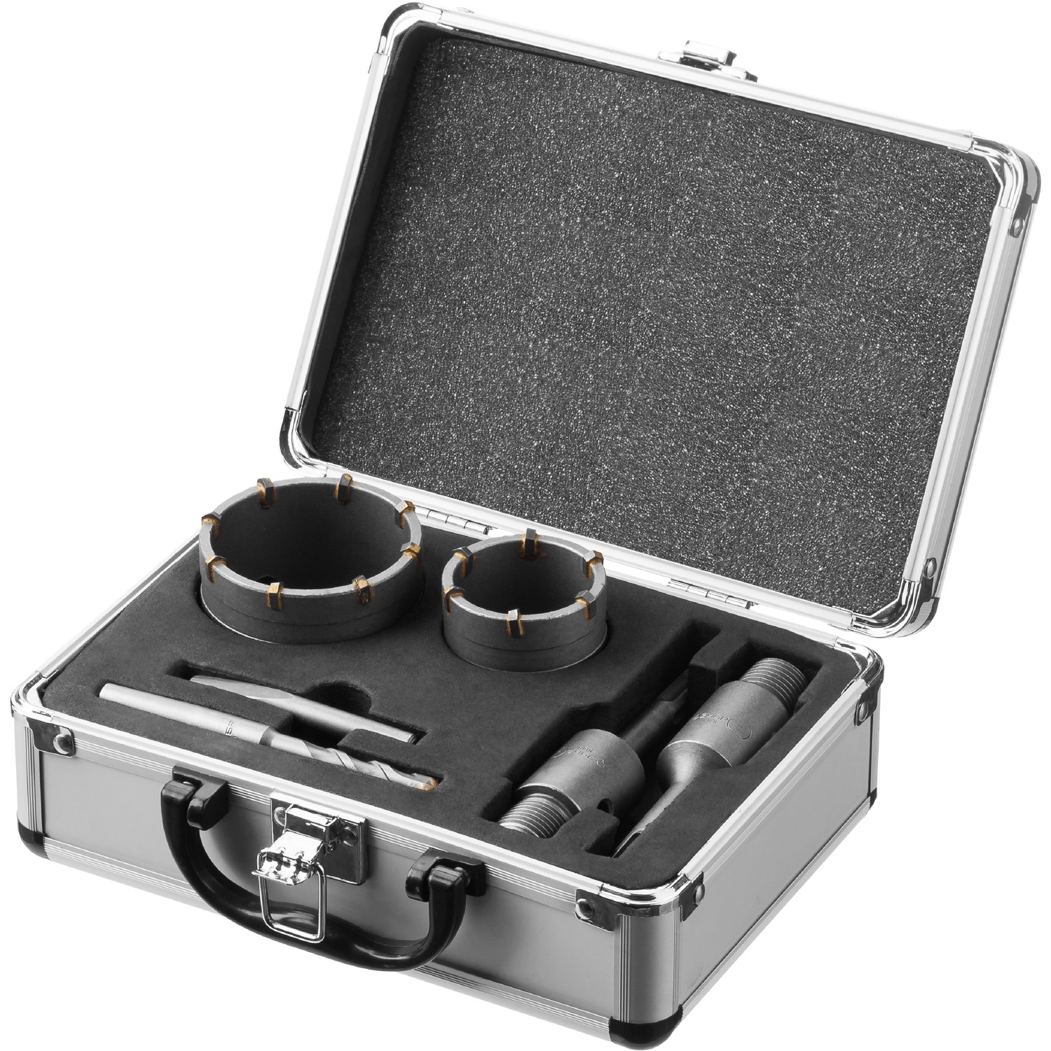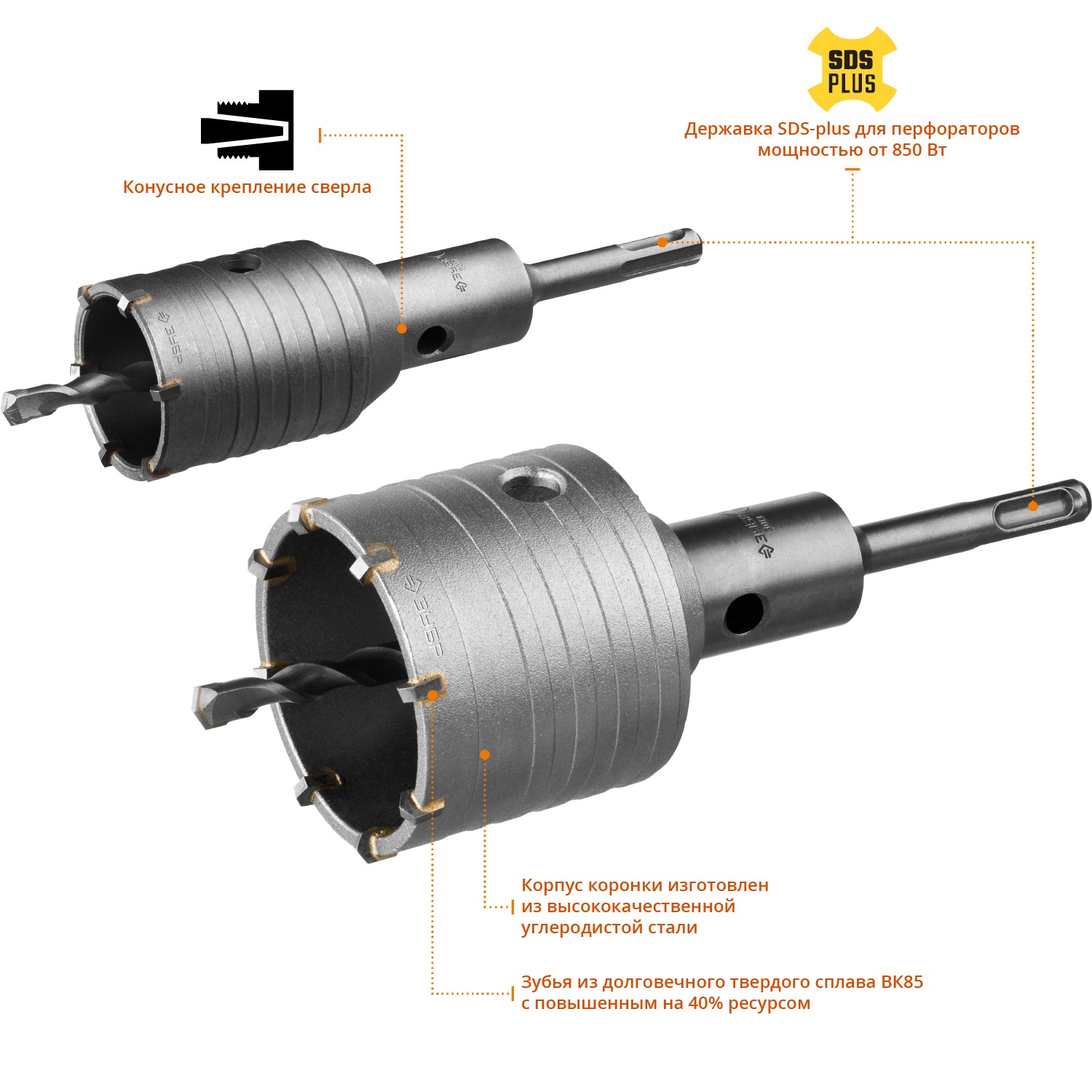 При прокладке коммуникаций в строящемся здании не обойтись без коронок по бетону. Они позволяют без труда получать отверстия среднего или большого диаметра в самых прочных материалах. Коронки имеют твердосплавные зубья из сплава ВК85, усовершенствованную систему крепления сверла на конус и резьбовое соединение с державкой М22.