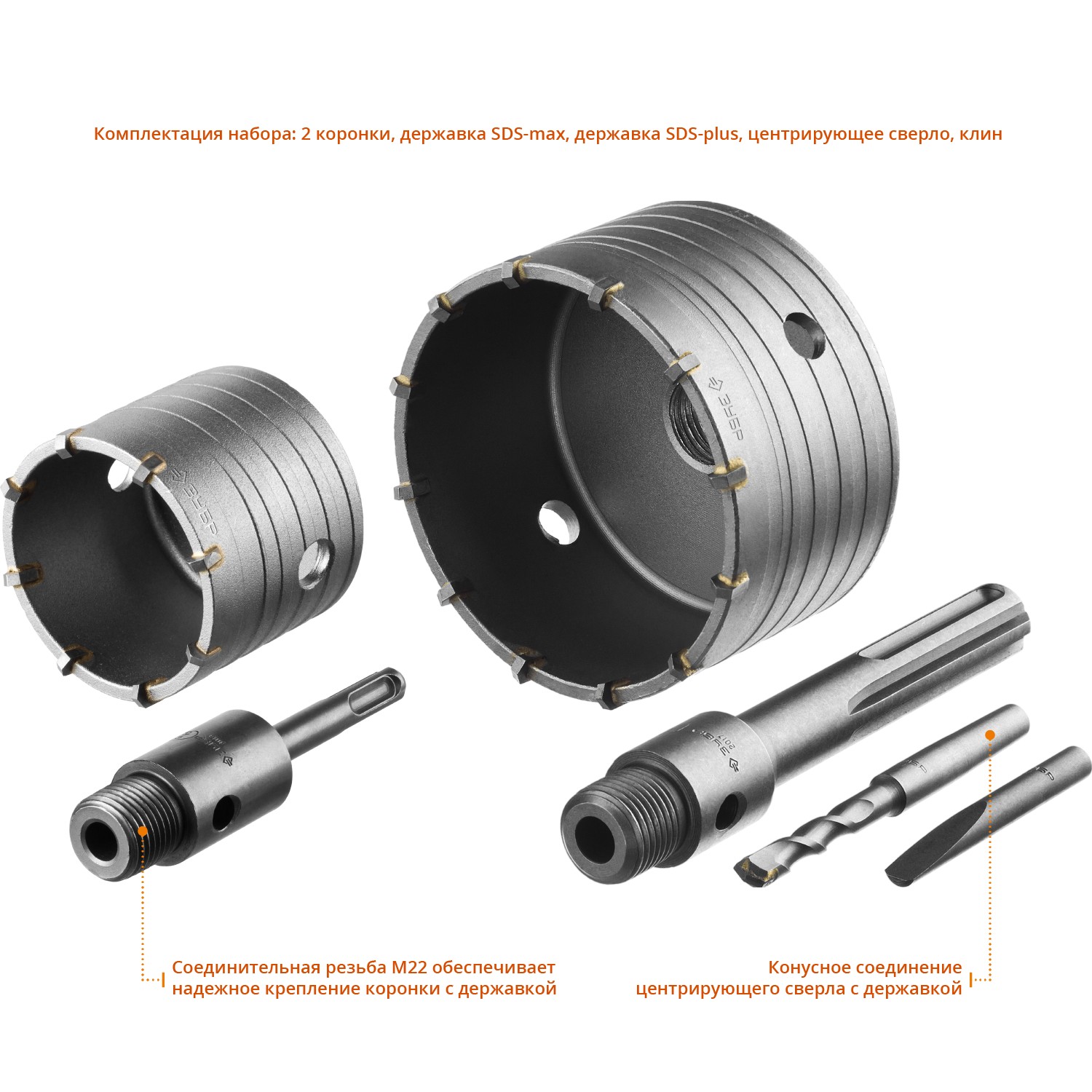 - Резьбовая посадка М22 обеспечивает надежное крепление коронки с державкой