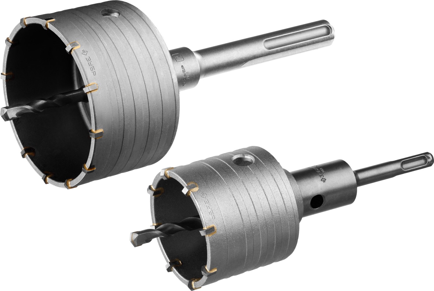 - Специальная спиралевидная форма корпуса коронки из высокопрочной стали уменьшает трение о стенки отверстия, ускоряет отвод шлама и повышает срок службы инструмента