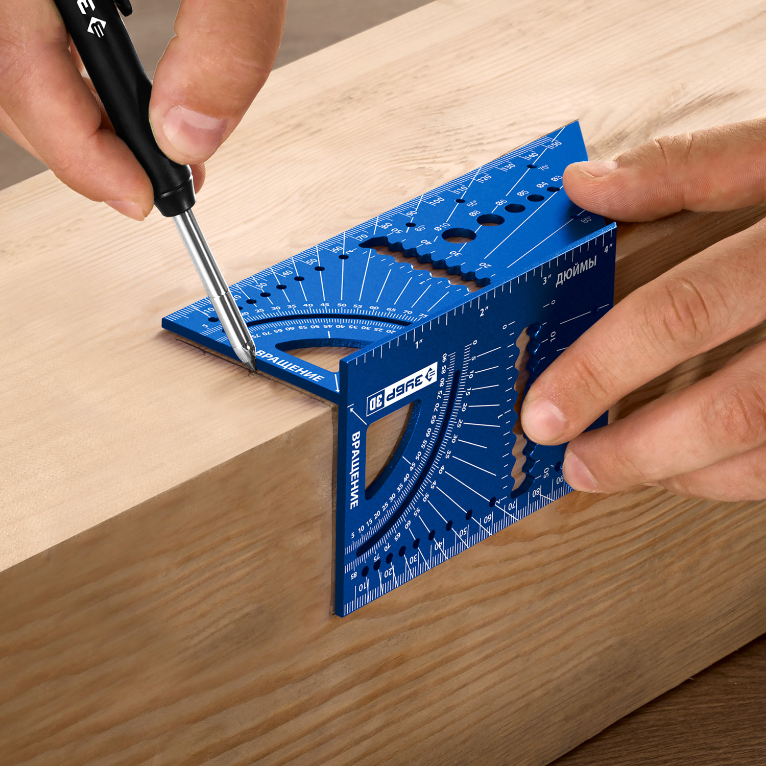 Профессиональный универсальный кровельный угольник инструмент для точной разметки объёмных конструкций, таких кк трубы, балки, направляющие. Имеет широкую область применения: разметка под углом 90 градусов, разметка под углом 45 градусов, разметка труб, рейсмус, транспортир, линейная разметка, определение размера сверла.